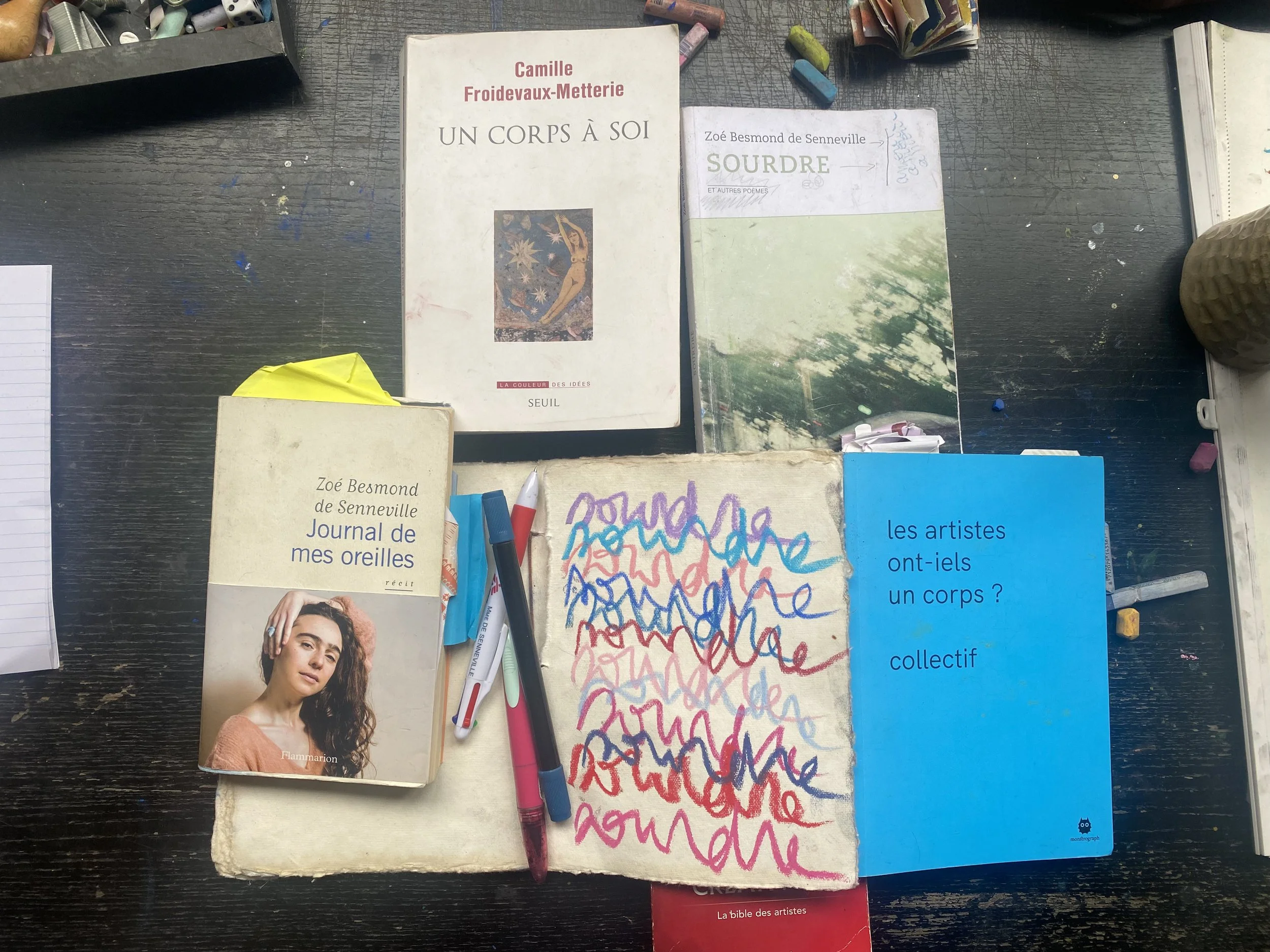 Née en 1987, Zoé est artiste autrice, interprète et modèle d’art. Elle écrit des textes, dessine, publie des livres, créé des expériences, performances et spectacles. Atteinte d’otospongiose, sa trajectoire intime devenue matière première, elle cherche à raconter le handicap invisible, ses impacts, sa réalité, la vulnérabilité qui devient force. Son œuvre, qui mêle écriture et expérience, transcende les frontières des formes artistiques pour inviter le spectateur à une immersion sensorielle et poétique. Elle développe en ce moment sa première création scénique, poésie-son-vidéo Sourdre, adapté de son premier recueil. Il sera créé en 26/27 aux Plateaux Sauvages.